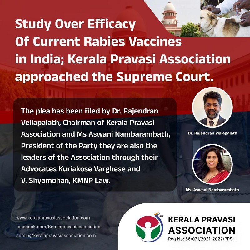 New Delhi: Kerala Pravasi Association, an Election Commission of India approved independent political party from India led by the “Pravasi” Community has filed a plea before the honourable Supreme Court of India seeking a direction for constituting an independent expert committee to study the efficacy of the Intra Dermal Rabies Vaccines (IDRVs) currently being administered to Humans, on account of the number of deaths that have occurred despite timely administration of the vaccines in the Country.